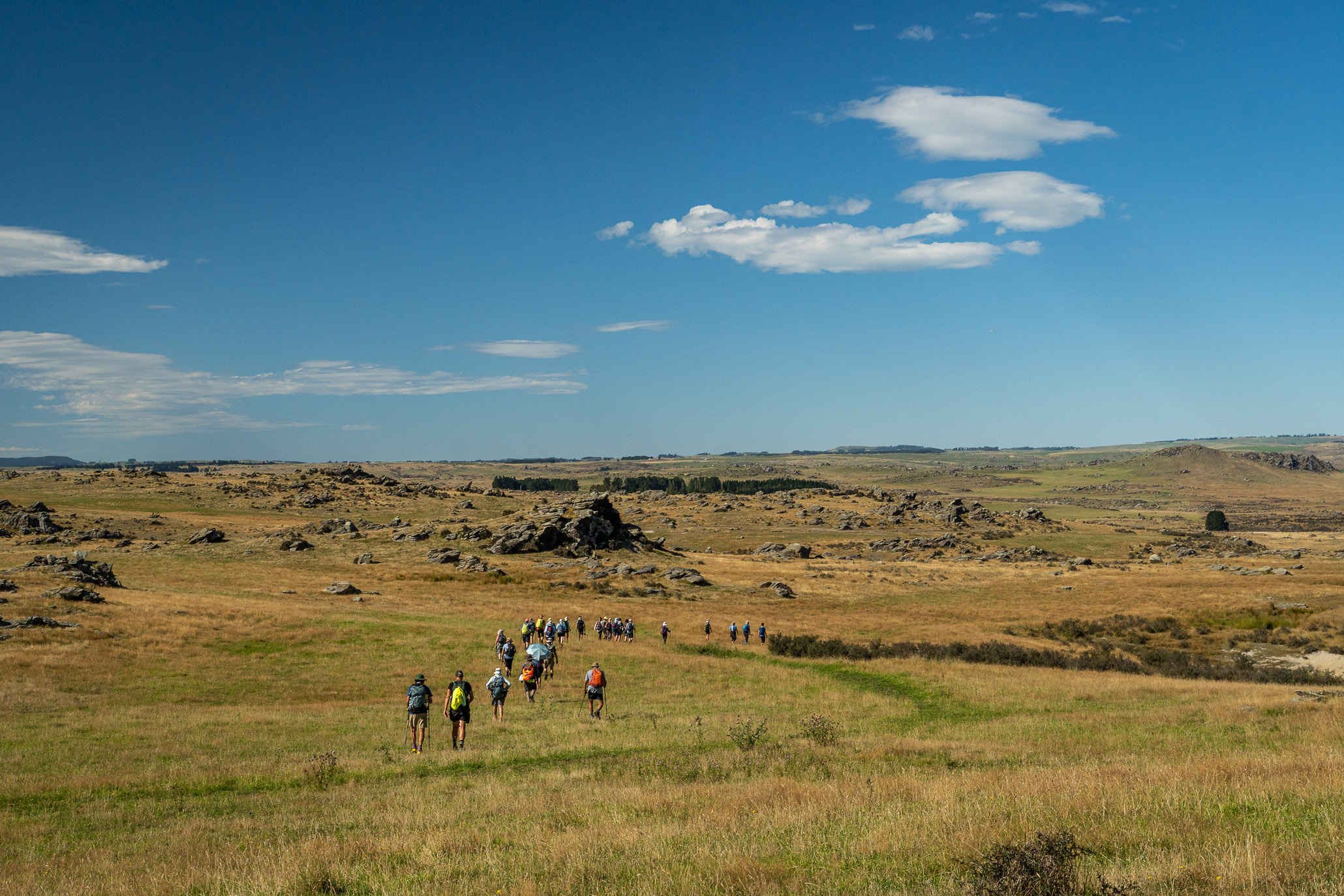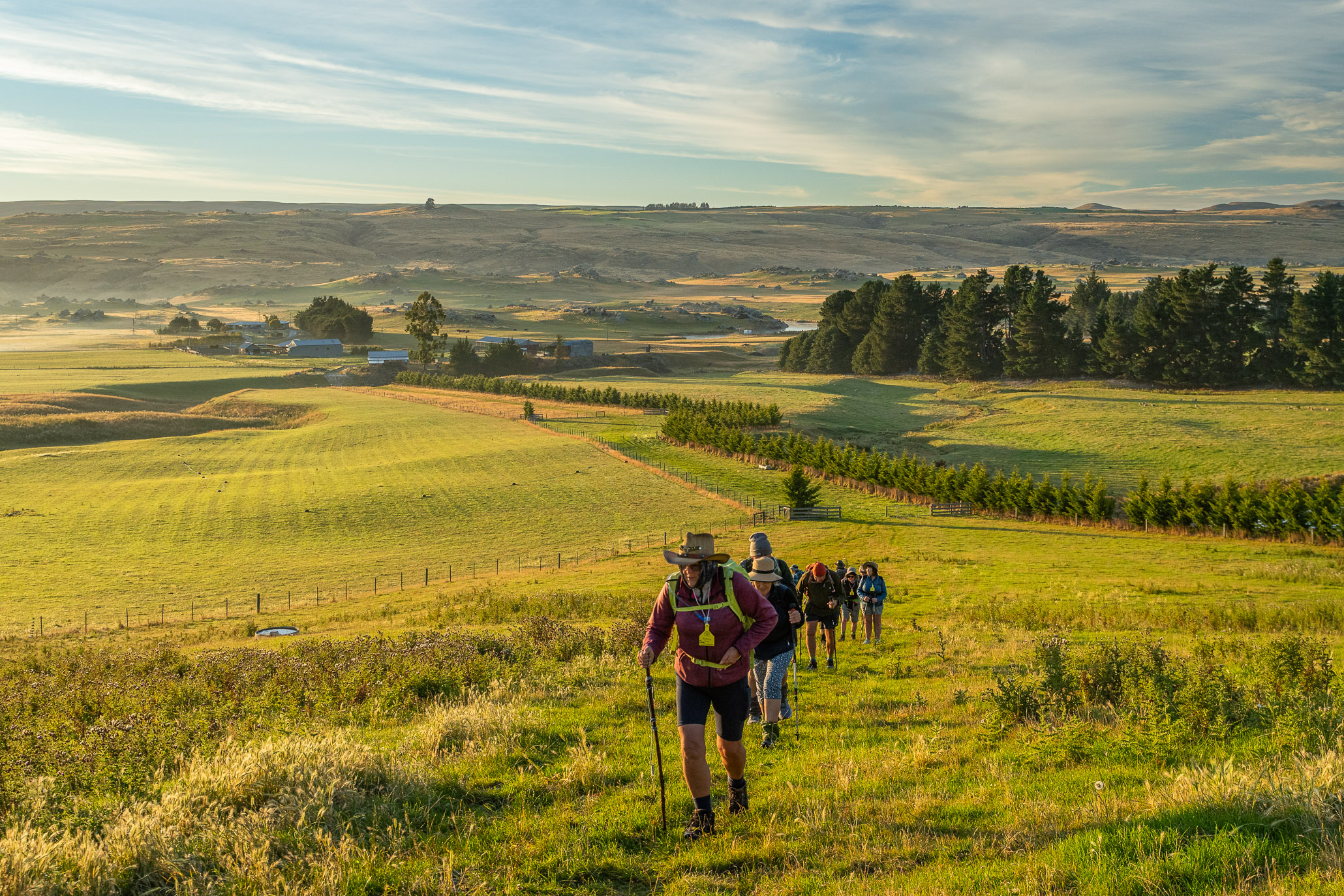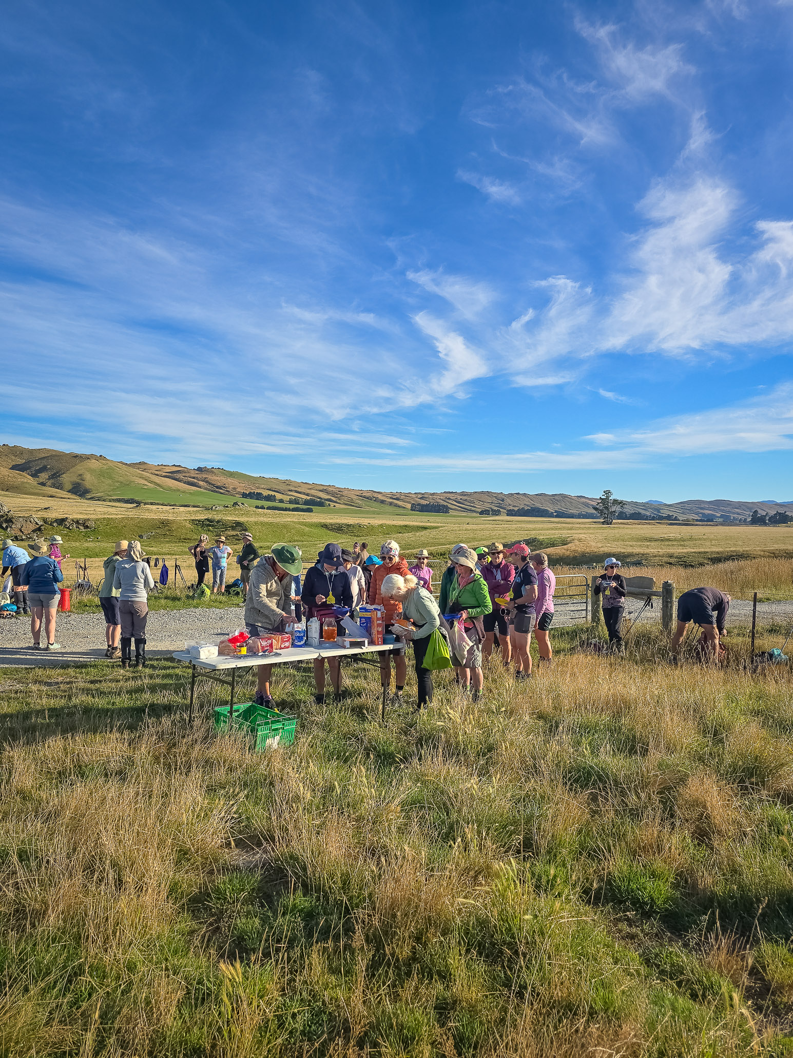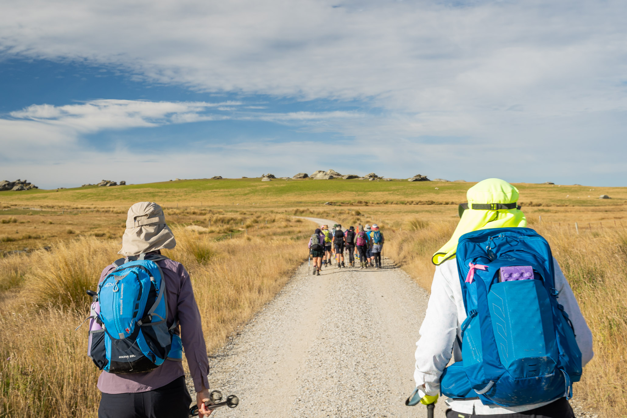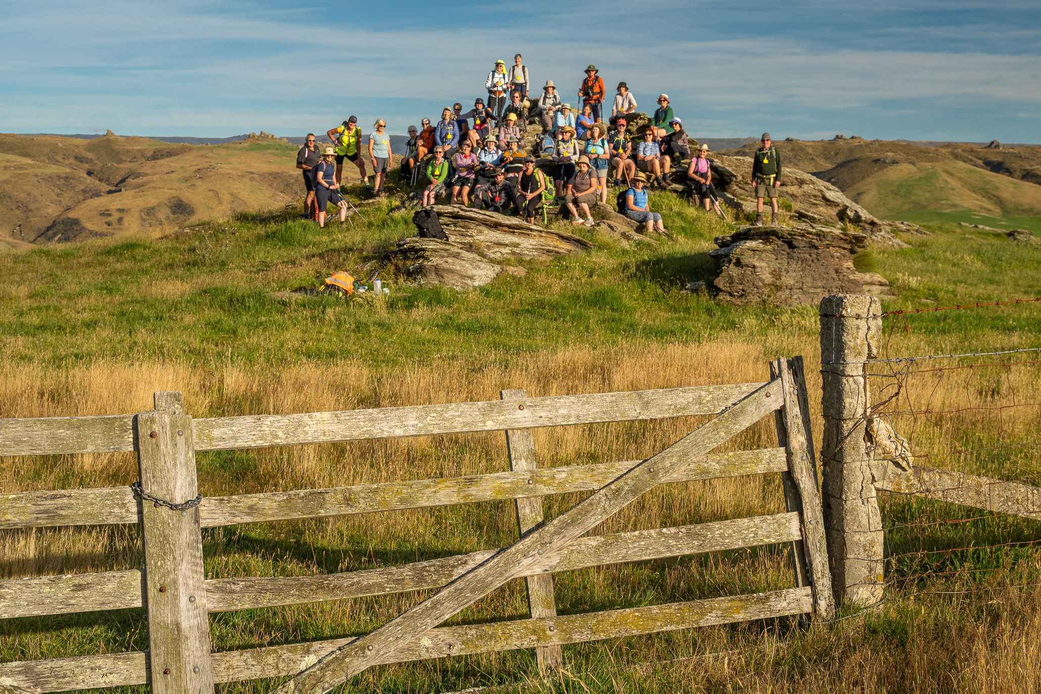 We left from Macraes, walked up Red Bank Road before turning off into Ross Rd towards the Nenthorn Conservation area. We were lucky Goldfields Cavalcade had both doc concessions and also the support of local farmers. Today one transported a few people to the top of a hill and showed us a slightly shorter way to our end point.