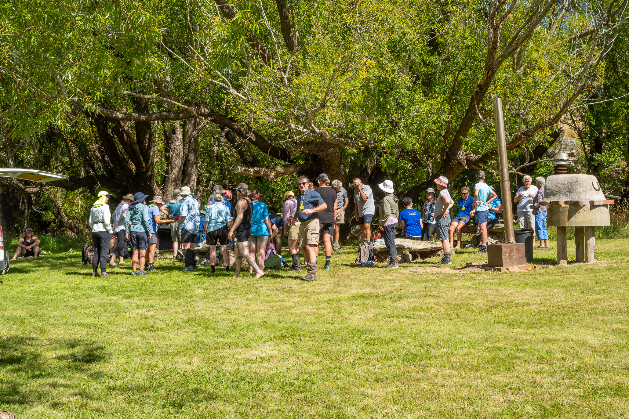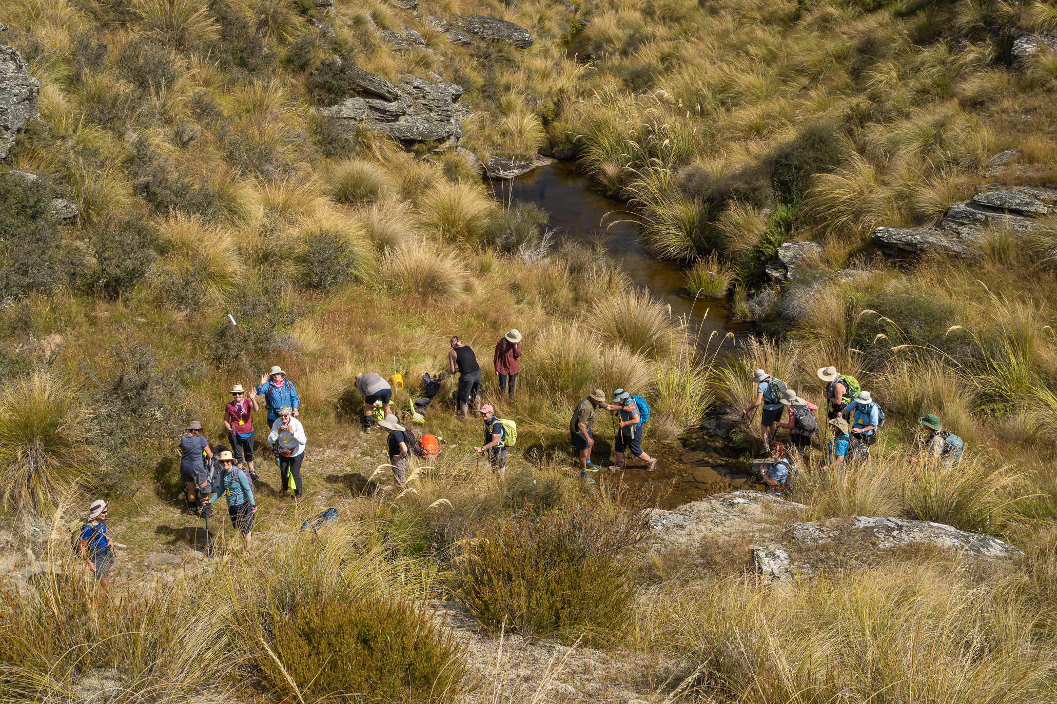 We were then met by the farmer, Bevan, who walked us through high tussocks, open land, a few creeks up and downs and all the way through to Nenthorn Conservation area. His estimate of about 4-6km was just a little out so when we got to close to the end there were a couple of vehicles with water and rides for those who had had enough of the sun.
