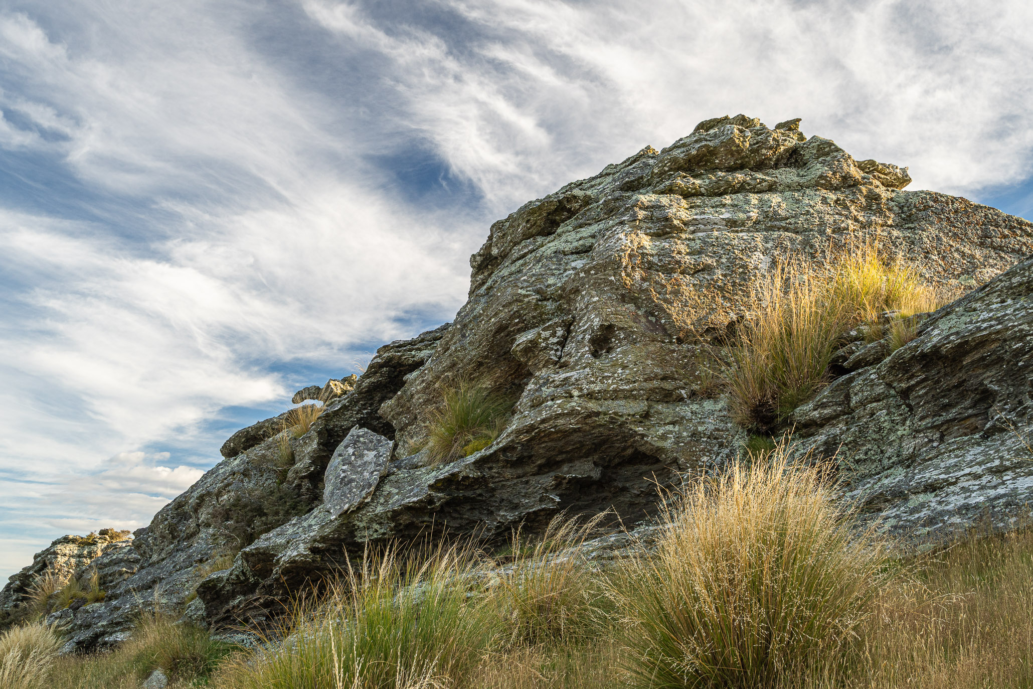 The first hill was fine, nice view from the top and with the day still cool not too much bother. This got us to our breakfast spot (always cereals and a cooked breakfast) before we headed up the real hill! This was the sort of hill that needs a zig zag track, but we headed straight up. The sun was starting to come out as well making it quite the challenge. Not super long though and stunning views across both ways once you got to the top. We were also now fully in the beautiful rocky landscape of the Strath Taieri which I love so much.