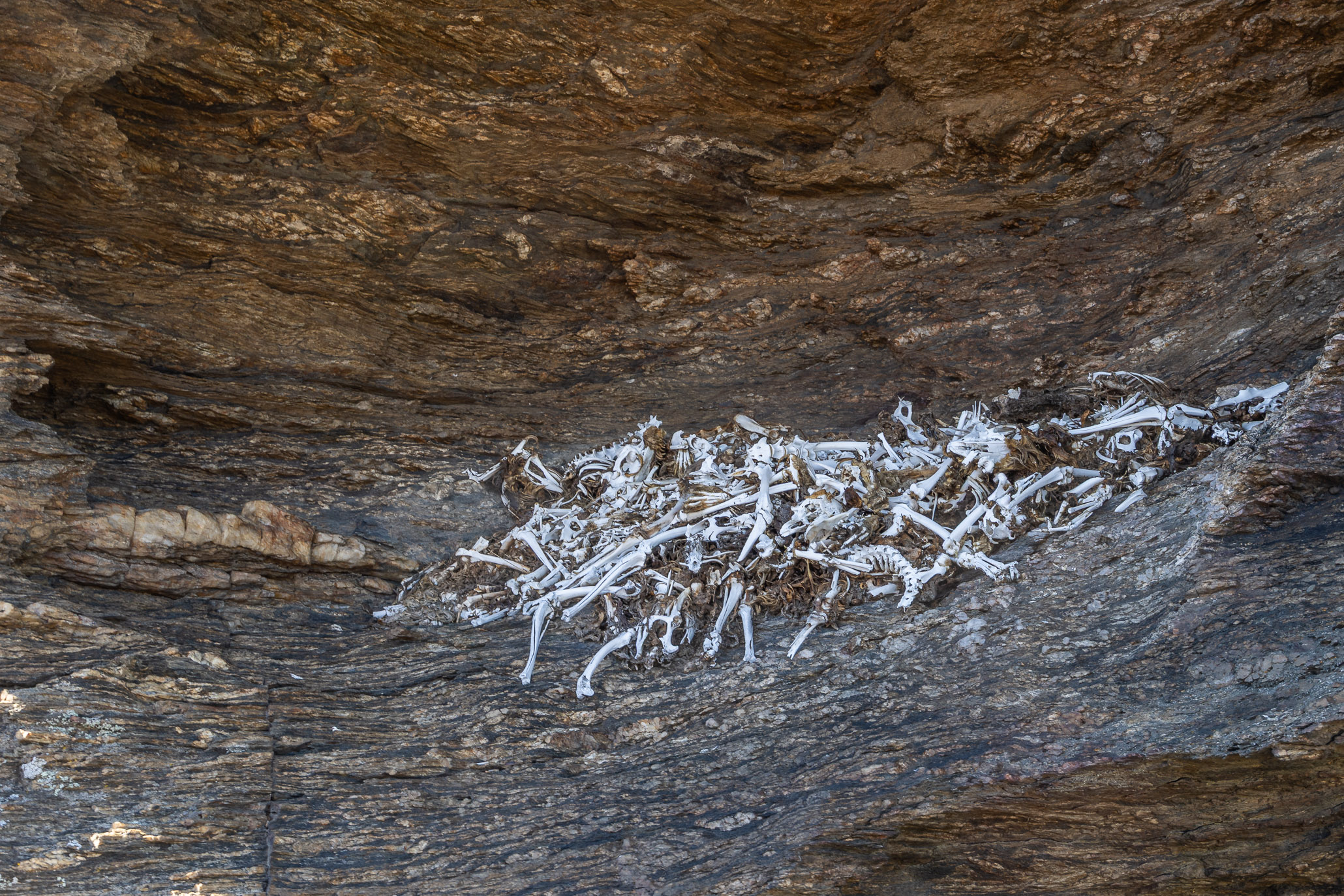 We walked across a couple of farmers land looking at old stone cottages, huge numbers of shist rocks and insane views. A much more undulating walk today . While no shade again the plan was to finish at the river for a swim and lunch, so we knew it was not going to be another 5pm finish. We were right in among the rocks today and came across a nest, we assume was a hawk or falcon, full of rabbit or small bird skeletons.